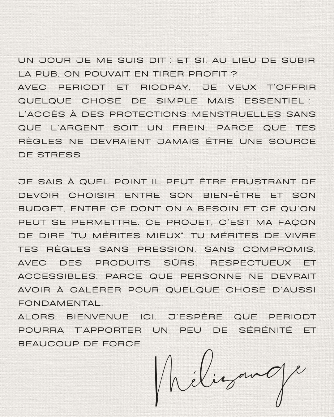 C’est pendant sa dernière année d’études en 2022 que Mélisange crée PERIODT, après avoir elle-même vécu la précarité menstruelle. Confrontée à l’impossibilité d’accéder à des protections hygiéniques quand elle en avait le plus besoin, elle réalise à quel point ce problème touche des milliers de personnes, sans réelle solution. Plutôt que de s’y résigner, elle décide d’agir.